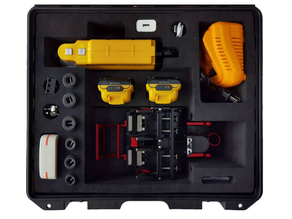 双线夹接火工具套装是一款专为配网不停电作业设计。该工具集成了线夹固定装置、引线固定装置、螺栓紧固装置及智能控制系统,能够高效快捷的完成异形双并沟线夹安装,显著提高不停电搭接火作业的工作效率。工具包含主机(固定装置和螺栓紧固装置)、充电器、遥控器、操作杆、专用包装箱等组件,适用于20kV及以下的不停电作业环境。